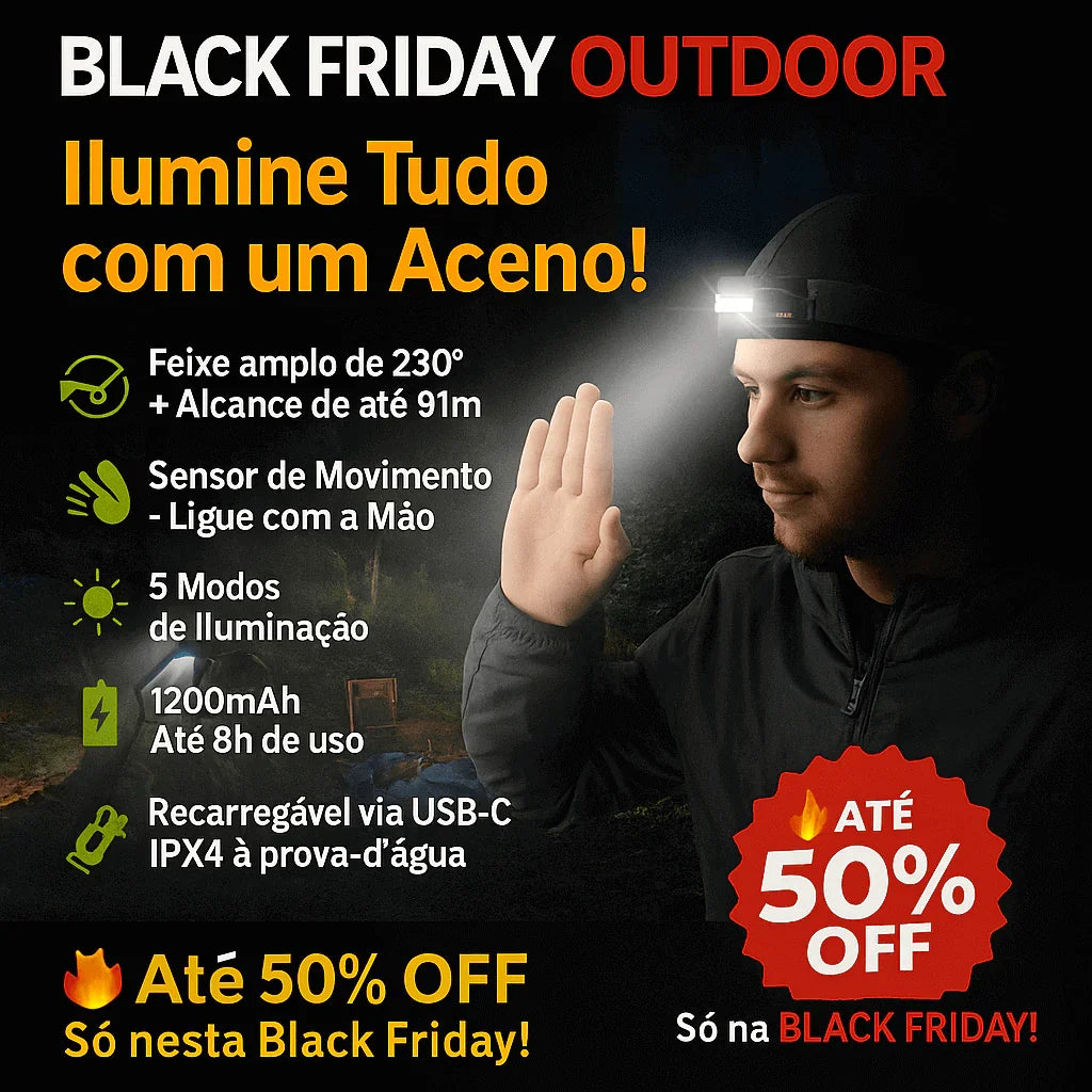 A lanterna de cabeça LED 230° com sensor de movimento combina potência, conforto e tecnologia para acompanhar você em qualquer desafio.
