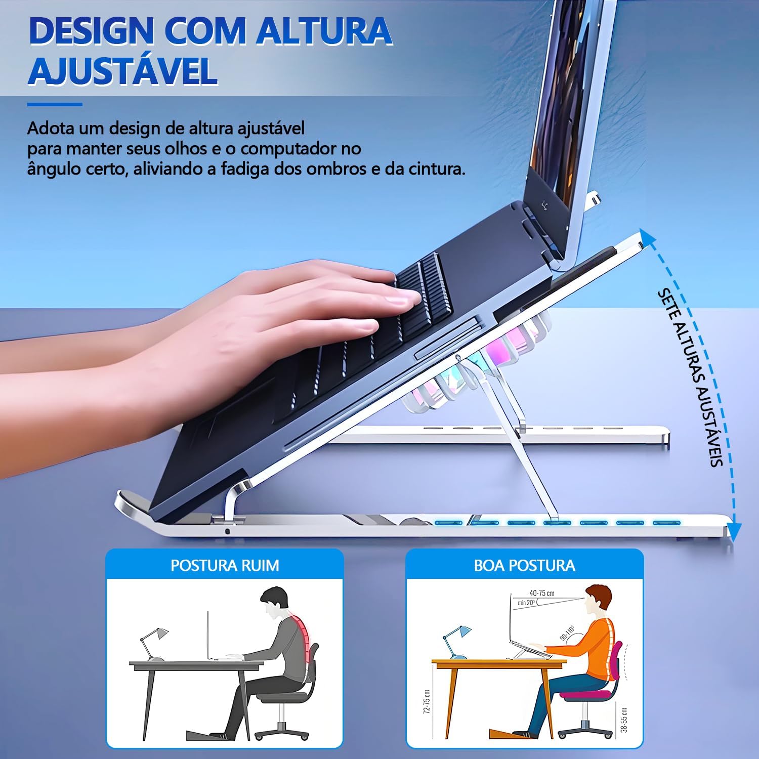 Com 6 níveis de altura, permite encontrar o ângulo ideal para a sua postura, ajudando a reduzir dores nas costas e no pescoço.