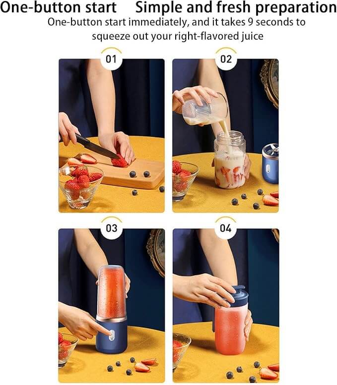 Com o Mini Liquidificador Portátil USB, você prepara sucos, vitaminas e shakes em qualquer lugar com apenas um botão.